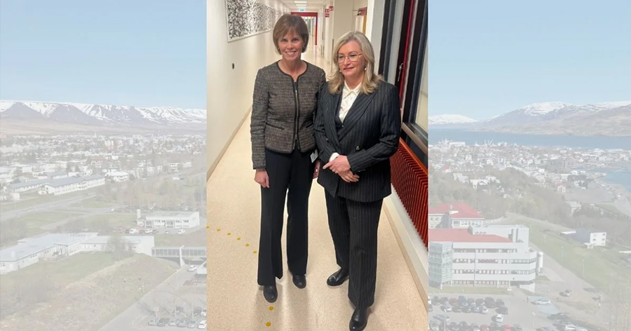 Hildigunnur Svavarsdóttir forstjóri SAk, til vinstri, og Alma Möller heilbrigisráðherra í loka síðasta mánaðar þegar ráðherra og föruneyti hans funduðu með stjórnendum SAk vegna erfiðrar stöðu á stofnuninni við mönnun ákveðinna sérgreina, sér í lagi lyflækninga. Mynd af vef SAk.