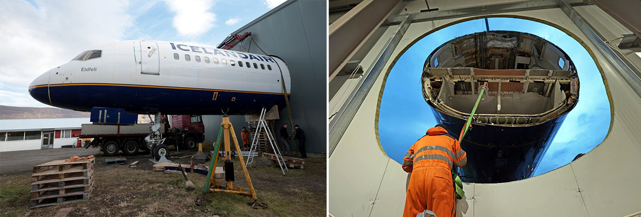 Merkileg „viðbygging“ við Flugsafn Íslands á Akureyrarflugvelli varð að veruleika. Um er að ræða fremsta hluta Boeing 757-223 þotunnar Eldfells, sem Icelandair afhenti safninu að gjöf fyrir nokkrum misserum, og skagar nú út úr norðurgaflinum. Innangengt verður í þotuna úr safninu.
