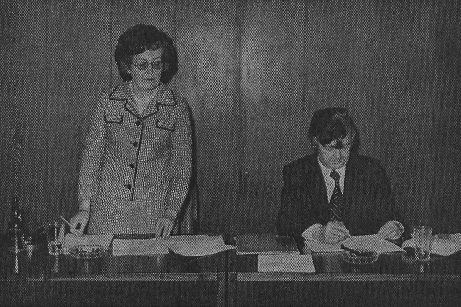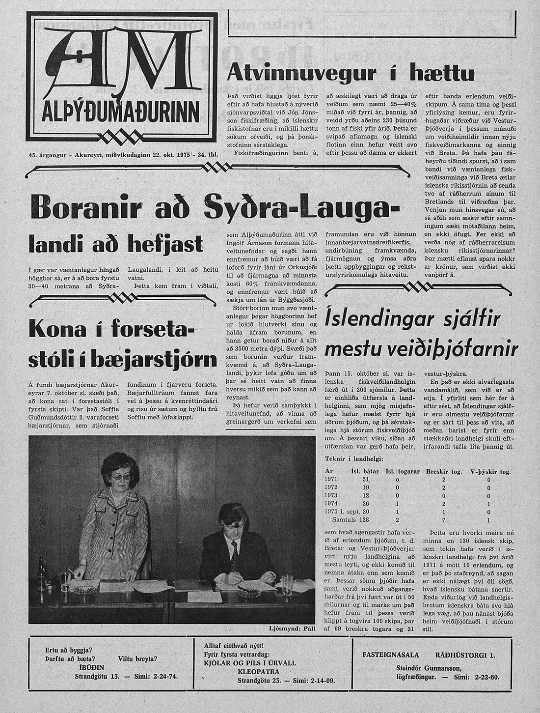 Soffía Guðmundsdóttir stýrir fundi bæjarstjórnar Akureyrar þriðjudaginn 7. október 1975. Til hægri er Bjarni Einarsson bæjarstjóri. Úrklippa úr Akureyrarblaðinu Alþýðumanninum. Mynd: Páll A. Pálsson.