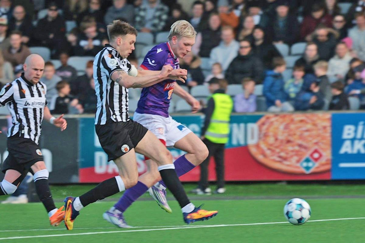 Víkingurinn Erling Agnarsson í baráttu um boltann við KA-manninn Danijel Dejan Djuric. KA-maðurinn til vinstri er Jeppe Pedersen. Mynd: Ármann Hinrik