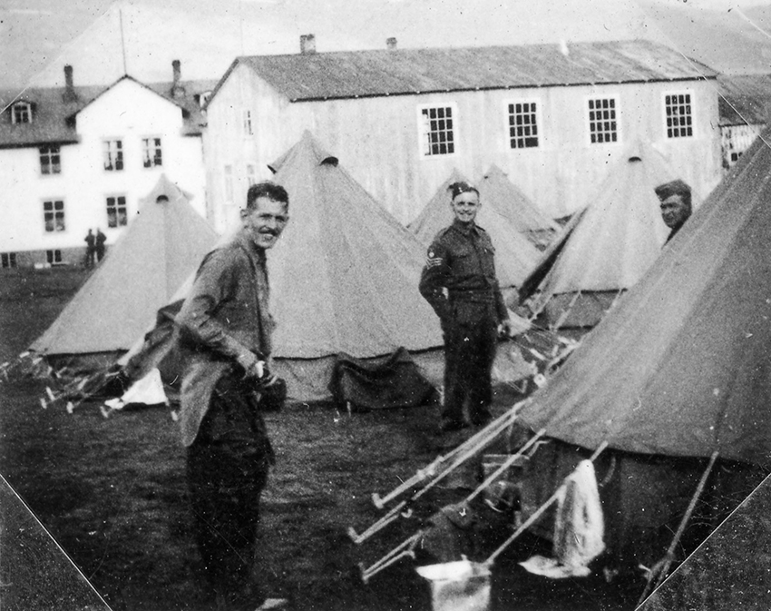 Richard Batemann Jessop liggur á beddanum í bragga hermannanna á Akureyri. Maðurinn með pípuna er líklega Dick Newsom.