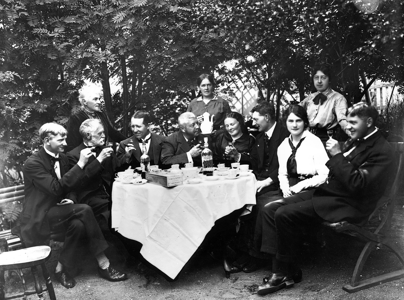 Garðveisla hjá Ölmu og Oddi Carl Thorarensen apótekara. Annar frá vinstri er Hendrik Schiöth og að baki hans frú Anna kona hans, þá Jón Stefánsson ritstjóri, Oddur og frú Alma Thorarensen, fædd Schiöth. Yst til hægri sitja Hinrik Thorarensen og frú Svanlaug kona hans og að baki hennar er Olivia Thorarensen. Oddur C. Thorarensen rak Akureyrar Apótek á árunum 1886–1918. Þau hjón Oddur og Alma ræktuðu fagran trjá- og blómagarð sunnan við húsið. Ræktunin hófst 1896 og var hann því einn elsti skrúðgarður bæjarins.