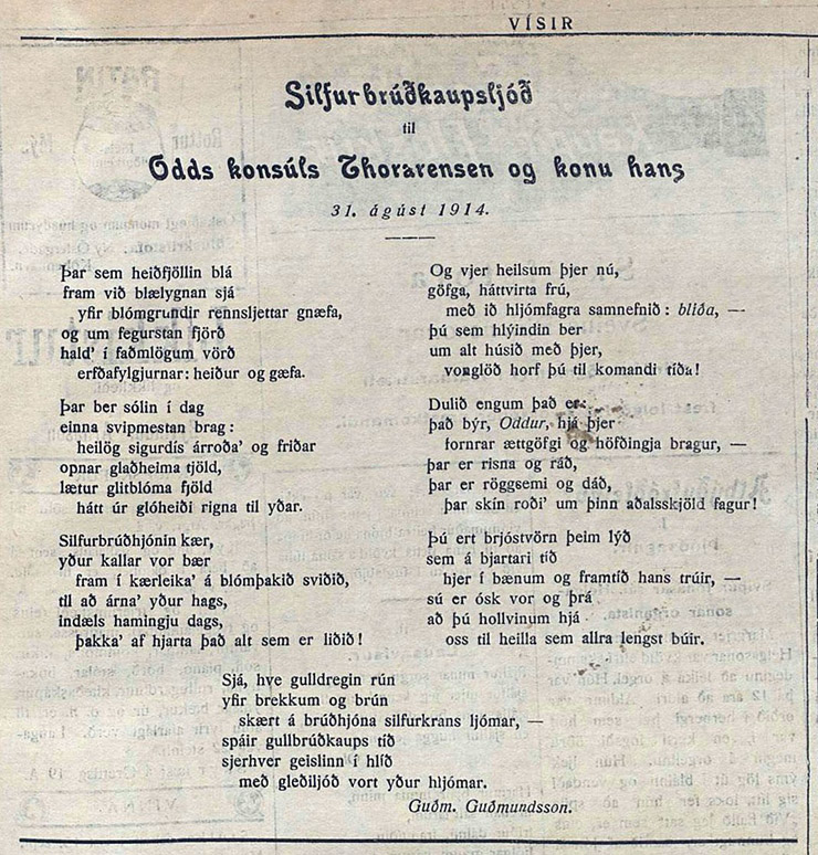 Silfurbrúðkaupsljóð til Ölmu og Odds Thorarensen eftir Guðmund Guðmundsson. Birtist í Vísi, 1. september 1914.