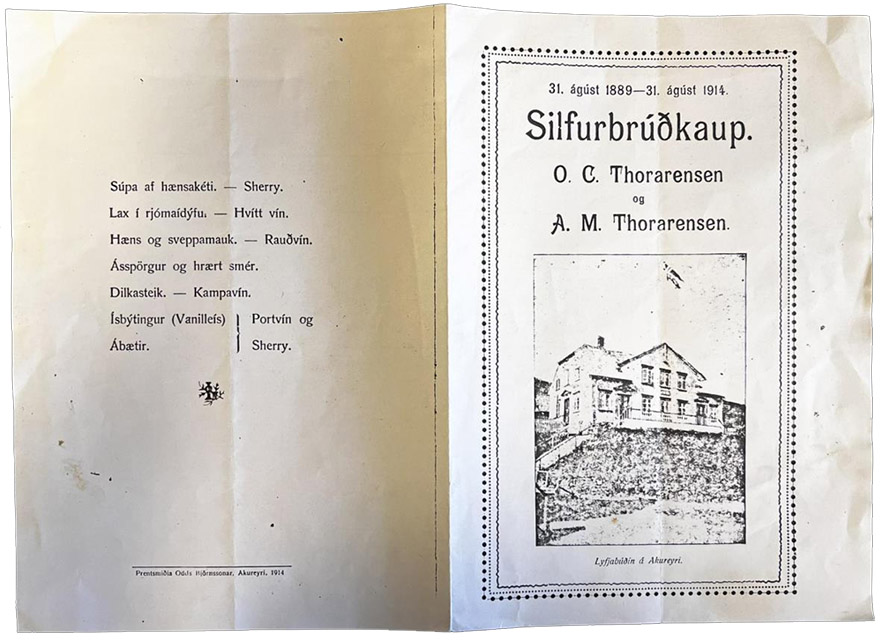 Hjónin Oddur Carl Thorarensen lyfsali og konsúll og frú Alma Clara Margrethe Thorarensen (fædd Schiöth) áttu silfurbrúðskaupsafmæli þann 31. ágúst árið 1914. Að því tilefni efndu þau til veislu og buðu til sín fínasta fólki bæjarins. Jafnvel kom fólk víðar að, en til að mynda komu hjónin Klemens Jónsson þáverandi landritari og Anna María Kl. Jónsson (fædd Schiöth) frá Reykjavík. Alma og Anna voru systur og Klemens fyrrum sýslumaður í Eyjafjarðarsýslu og bæjarfógeti á Akureyri. Fjölluðu nokkur blöð stuttlega um samkvæmið og þótti það hafa tekist afar vel til. Einn boðsgestana, séra Matthías Jochumsson hafði samið kvæði til þeirra hjóna og það gerði einnig Guðmundur Guðmundsson (mun það að öllum líkindum vera Guðmundur skólaskáld), en hann var ekki í veislunni. Birtust bæði kvæðin á prenti í blöðum fljótlega eftir veisluhöldin.
