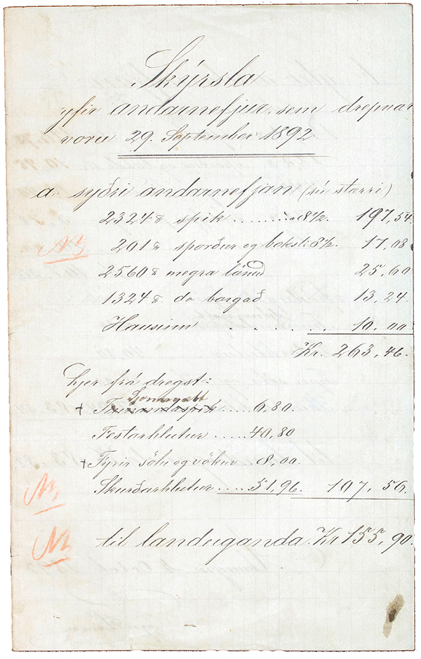 Enn fór hugurinn á flug því í skjölum bæjarins fann ég skýrslu yfir tekjur og gjöld sem leiddu af þessum hvalreka. Skýrslan er skemmtilega akureyrsk því talað er um syðri og ytri andarnefjuna en þarna koma fyrir orð sem rétt er að útskýra. Sjónarvætt er heiti á launum manns fyrir að finna hval; festarhlut átti sá eða þeir sem fyrstir urðu til að festa bönd á dauðum hval á floti og skurðarhlut fær sá er sker. Mælieiningin í skýrslunni er pund og virðið í krónum.
