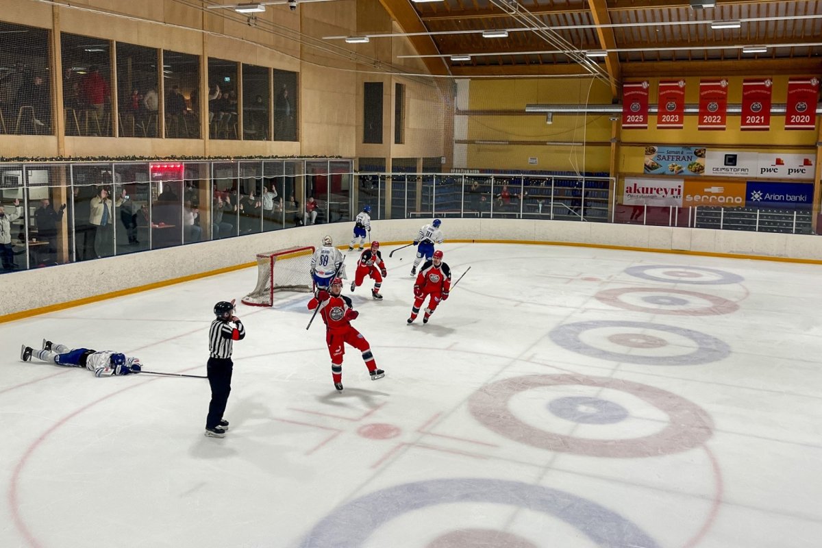Það voru þó gestirnir sem náðu forystunni þegar stutt var eftir af fyrstu lotunni. Sölvi Atlason skoraði þá eftir stoðsendingu Hauks Steinssen, var fyrstur í lausan pökk eftir að Jakob Jóhannesson varði skot Hauks.