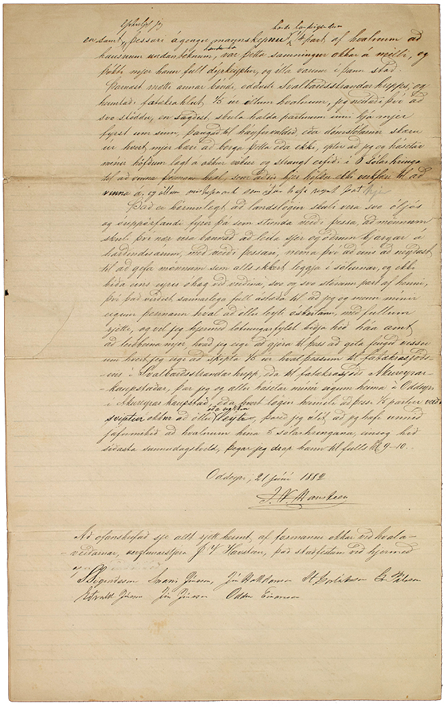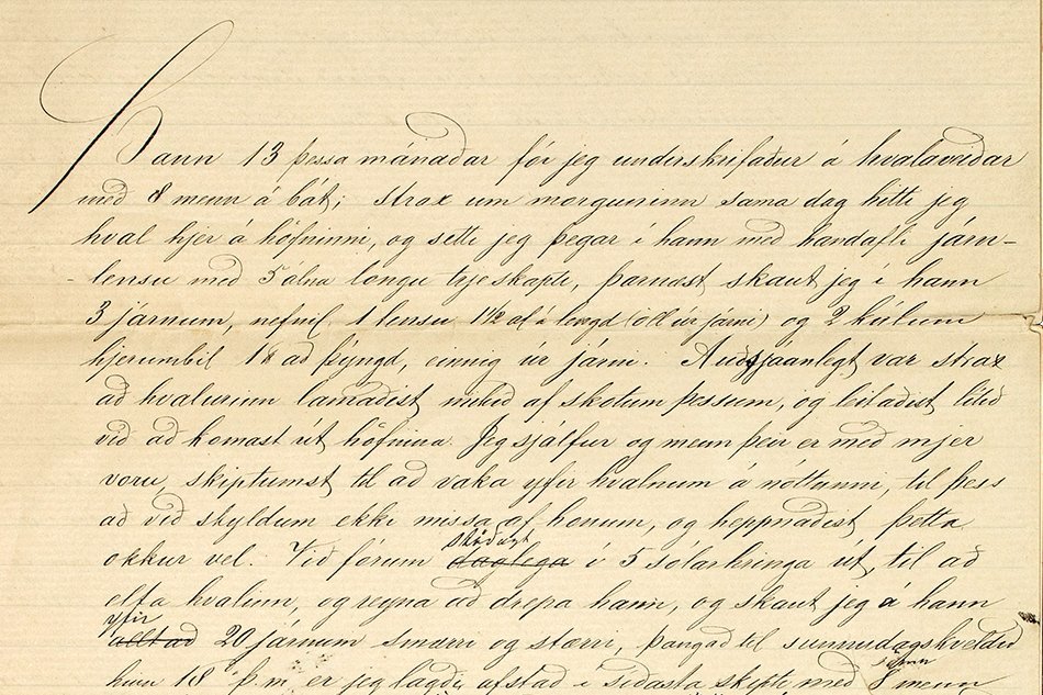 Þann 13. þessa mánaðar fór jeg undirskrifaður á hvalveiðar með 8 menn á báti. Strax um morguninn sama dag hitti jeg hval hjer á höfninni, og setti jeg þegar í hann með handafli járnlensu með 5 álna löngu trjeskapti, þarnæst skaut jeg í hann 3 járnum, nefnil. 1 lensu 1 ½ al á lengd (öll úr járni) og 2 kúlum hjerumbil 1 [pund] að þýngd, einnig úr járni. Auðsjáanlegt var strax að hvalurinn lamaðist mikið af skotum þessum, og leitaðist lítið við að komast út höfnina [það er af Pollinum]. Jeg sjálfur og menn þeir er með mjer voru skiptumst til að vaka yfir hvalnum á nóttunni, til þess að við skyldum ekki missa af honum, og heppnaðist þetta okkur vel. Við fórum stöðugt í 5 sólarhringa út, til að elta hvalinn, og reyna að drepa hann, og skaut jeg á hann yfir 20 járnum smærri og stærri, þangað til sunnudagskveldið hinn 18. þ.m. er jeg lagði afstað í síðasta skipti með sömu 8 menn á bátnum, þar við sáum hvalinn kl 7 í ísnum utan við Oddeyrina. Klukkan 8-9 um kveldið komumst við að honum og sá jeg strax að hann var mjög sár og dasaður; við hittum hann hjerumbil 150-200 faðma undan landi út af Oddeyrinni, og þar fleygði jeg í hann skutli með færi við, rjett á eptir kl 9 skaut jeg úr hvalabyssu minni 2 álna járnskutli, og hafði jeg í honum 70 faðma langa trássu nýja. Skutullinn fór á kaf inní hol á hvalnum svo hjerumbil ½ alin af honum stóð inní inniflin. Hvalurinn kenndi undireins svo mikils sársauka við þetta banaskot hans, að hann tók á harða rás, og þaut þvert yfir um fjörðinn, rakst hann opt á hafísjaka sem fyrir honum urðu á leiðinni, og það svo hart að hartnær skíðastóllinn losnaði í hausnum, hann dró ýmist bátinn sem við vorum á, eptir sjer, ellegar þá dufl þau sem við höfðum fest við skutulfestarnar, sem við fleygðum út þegar ísjakar urðu í veginum. Við sáum að hvalurinn linaðist alltaf meir og meir, og gátum við vel fylgt honum eptir þó við opt þyrftum að krækja fyrir ísjaka, en hvalurinn fór alltaf sama beina strikið, opt með hægri ferð seinast, þangað til hann kenndi grunns á förunni í Sigluvíkurlandi. Þar lagði jeg hvalinn með lagjárni, og brá honum litið við fyrr en undir hið síðasta að hann tók dauðateigjurnar, þá barði hann sjóinn ákaflega með sporðinum nokkur augnablik.