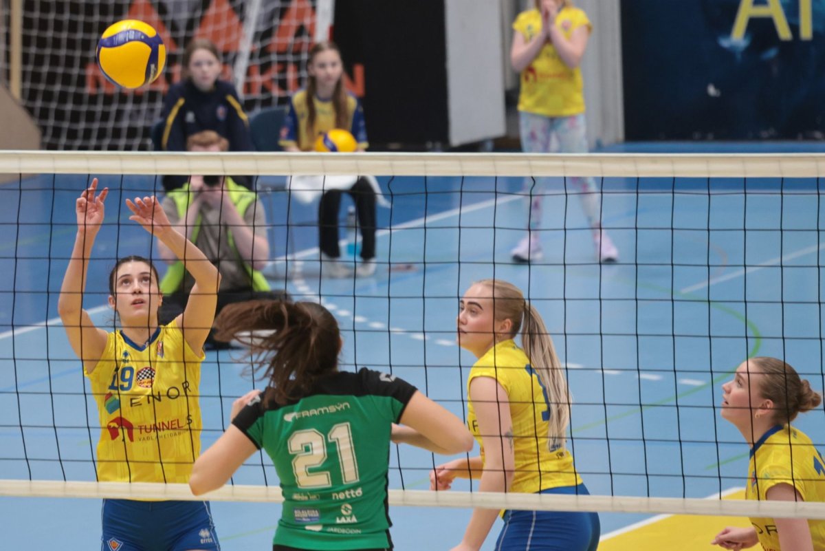 Lucia Martin Carrasco, númer 19 lengst til vinstri, sem hér sendir boltann yfir netið í undanúrslitunum gegn Völsungi á dögunum, var stigahæst KA-kvenna í dag. Hún gerð 26 stig en Julia Bonet Carreras gerði 24. Mynd: Skapti Hallgrímsson