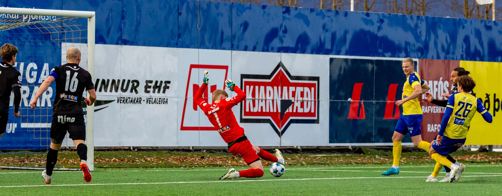 Það voru hins vegar gestirnir sem byrjuðu betur í dag og strax á 7. mínútu kom Baldvin Þór Berndsen þeim yfir með stórkostlegu marki. Þrumuskot langt utan af velli beint upp í samskeytin. Eitt glæsilegasta mark ársins - en samt bara það næstfallegasta í leiknum!
