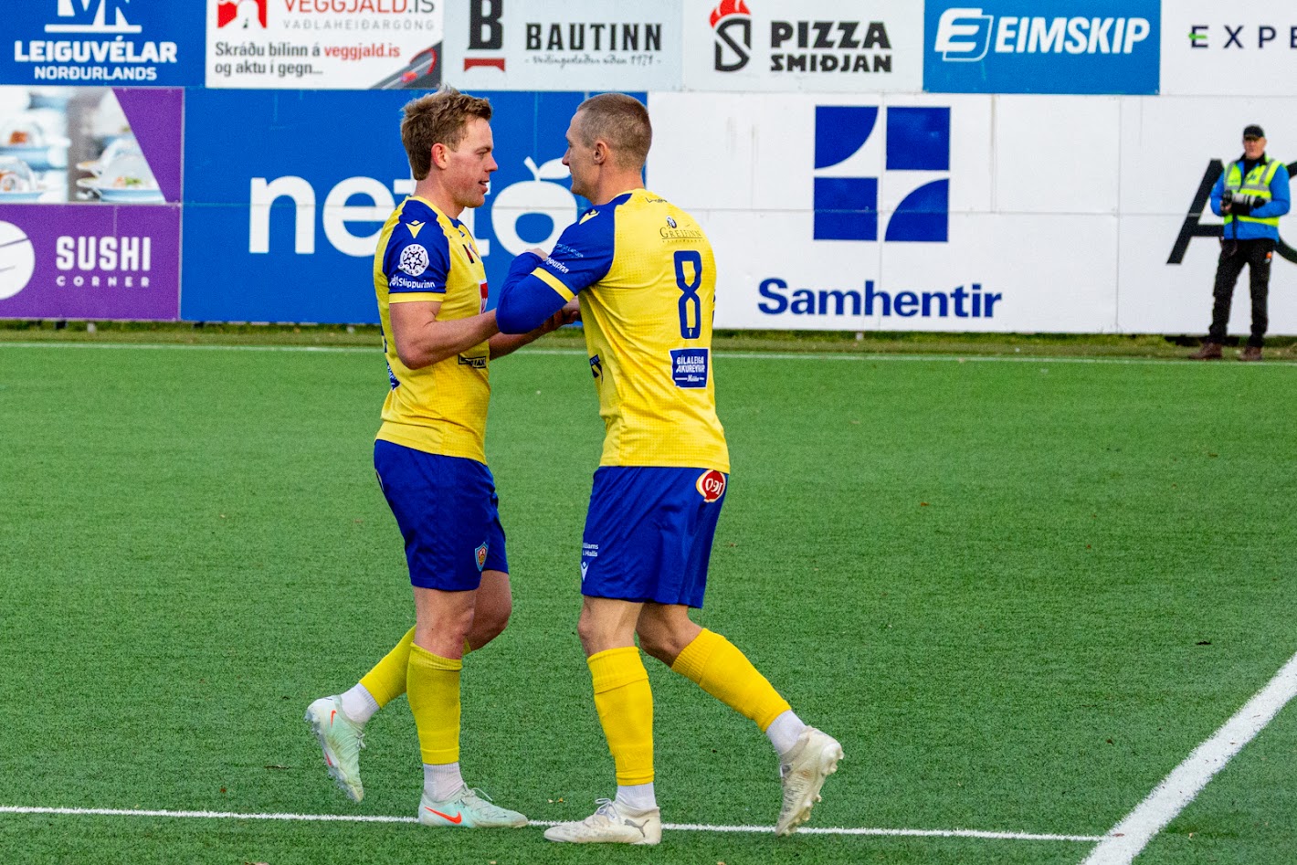 Glæsilegur 5:1 sigur í höfn og KA komst upp fyrir Eyjamenn í 7. sætið. Þessi lið mætast í Eyjum í lokaumferðinni og berjast um það hvort liðið hafnar í 7. og efsta sæti neðri hluta deildarinnar. Eyjamenn þurfa sigur, að öðrum kosti er 7. sætið KA-manna.