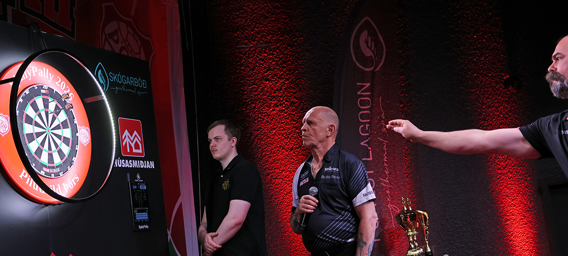 Um 500 manns fylgdust með á laugardagskvöldið og komust færri að en vildu; þetta fjölmennasta pílumót ársins er ekki einungis íþróttakeppni heldur gleðisamkoma par excellence; gamla, góða Sjallastemningin endurvakin að einhverju leyti, enginn dans að vísu stiginn við undirleik Eydals en á sviðið stigu Magni Ásgeirsson og rapparinn Saint Pete á milli þess sem pílurnar svifu og karlarnir kunnu úr Ally Pally í gegnum árin, kynnirinn John McDonald og Russ Bray, dómari og „kallari“, hófu upp raust sína.