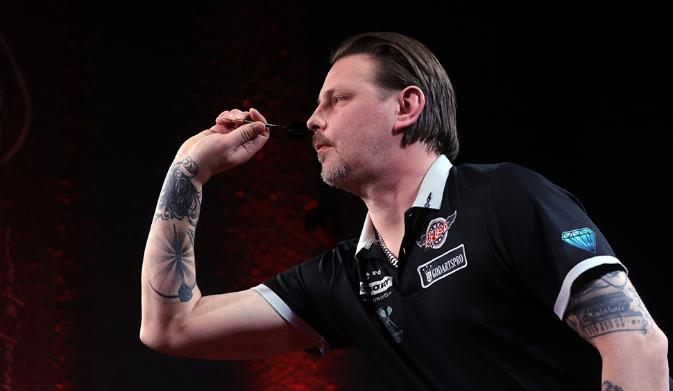 Vitor Charrua, sem varð annar á mótinu, horfir á eftir pílu sinni stingast í spjaldið.