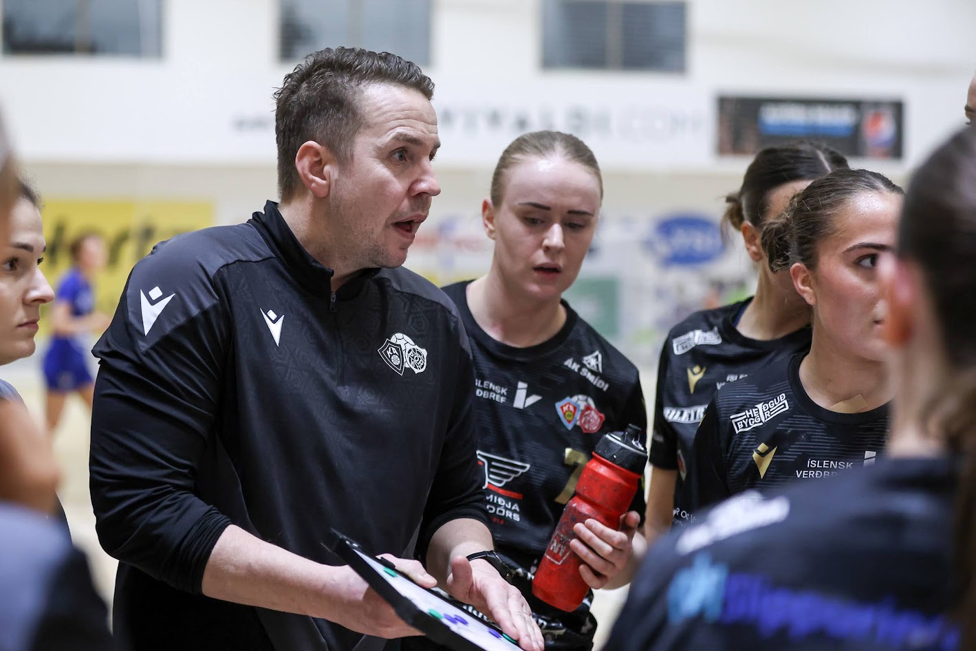 Jónatan Magnússon, þjálfari KA/Þórs, ræðir við leikmenn liðsins á Nesinu í kvöld.