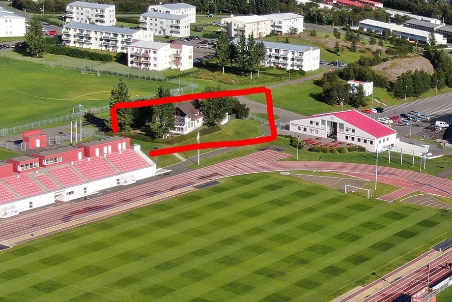 Gert er ráð fyrir að íþróttahúsið verði á svæðinu þar sem þarna er merkt með rauðu og muni tengjast bæði félagsheimilinu Hamri og áhorfendastúkunni við Þórsvöllinn. Mynd: Þorgeir Baldursson