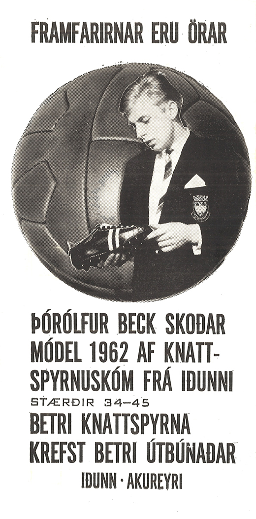 Um áratugaskeið fór fram fjölbreytt skóframleiðsla á Akureyri. Skóverksmiðjan Iðunn framleiddi skó sem seldir voru um allt land. Meira um það síðar. Eitt af því sem var framleitt var hjá Iðunni voru knattspyrnuskór, takkaskór. Slíkir skór rötuðu á fætur margra knárra knattspyrnumanna en líklega hefur enginn þeirra verið jafn hæfileikaríkur og Þórólfur Beck.