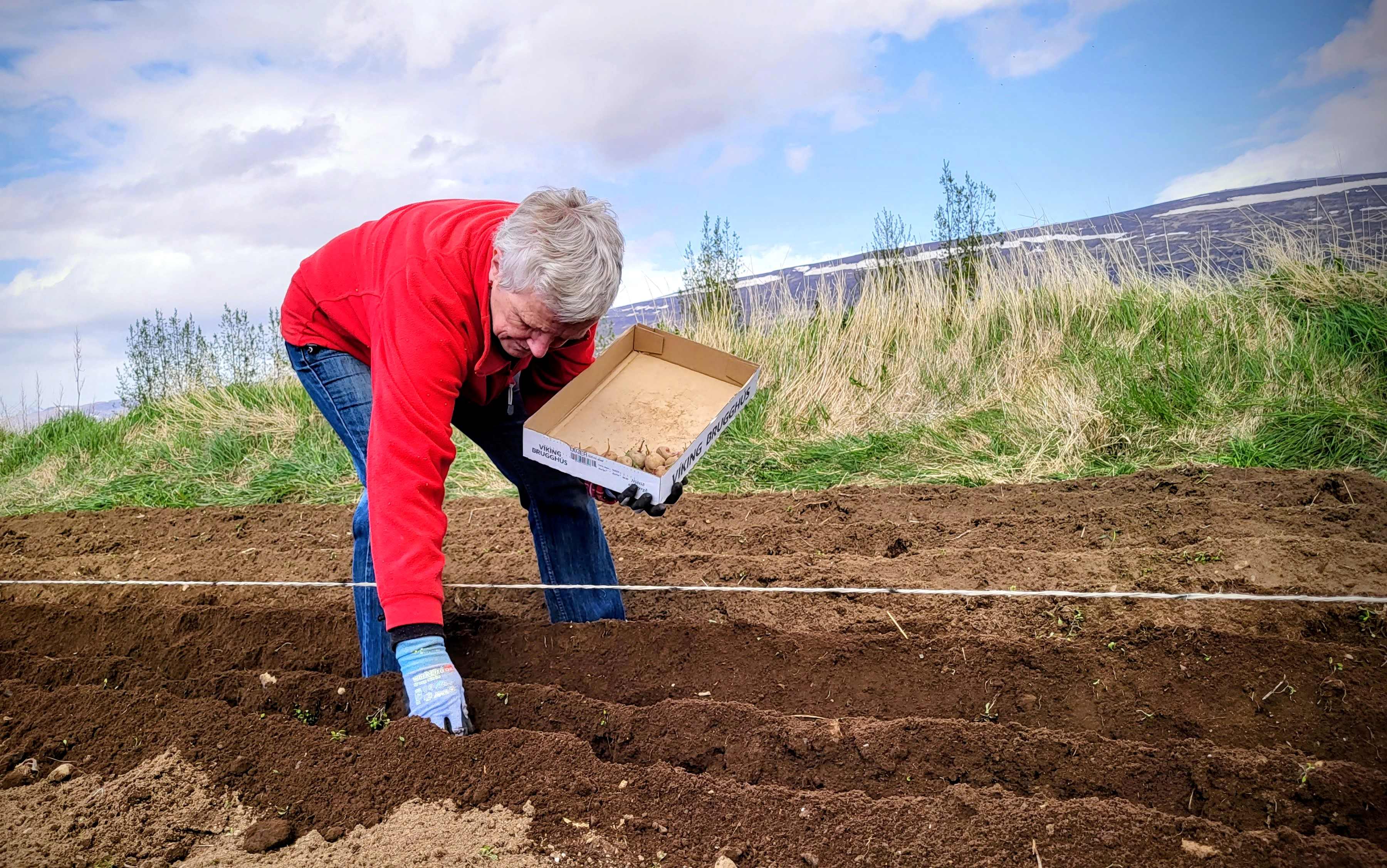 Lára setur niður útsæði í maí 2023. Mynd: Haraldur Ingólfsson.