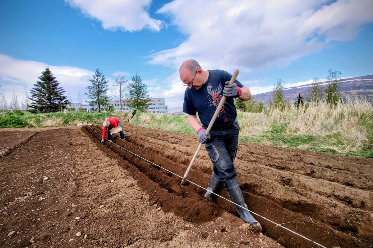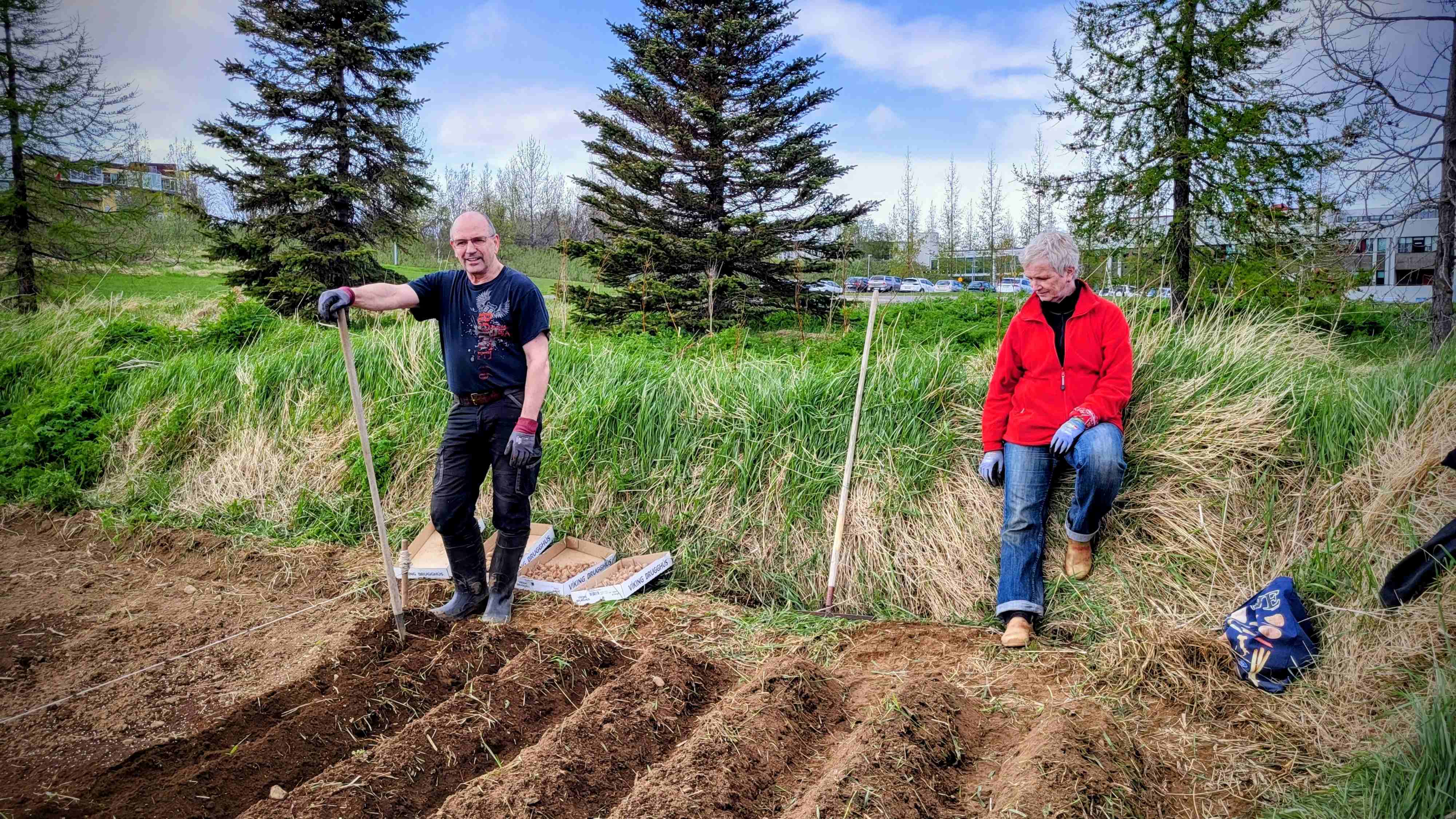 Í maí 2023 veltu þau Sigurgeir Haraldsson og Lára Ólafsdóttir fyrir sér hvort þau væru að setja niður útsæði í síðasta skipti í garðinn sunnan Sjúkrahússins. Gátu alveg eins átt von á að garðarnir þyrftu að víkja með nýju skipulagi vegna stækkunar Sjúkrahússins, en þau geta andað léttar og haldið kartöfluræktinni áfram eins og undanfarna áratugi. Mynd: Haraldur Ingólfsson.