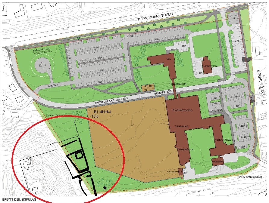 Breytt deiliskipulag samkvæmt tillögu sem nú er unnið með fyrir lóð Sjúkrahússins á Akureyri. Minjar sem þarfnast rannsóknar má sjá innan rauða hringsins, en hér er um að ræða gamla garða (girðingar) við kartöflugarðana sem voru mun umfangsmeiri en þeir eru í dag. Skjáskot úr deiliskipulagstillögu.