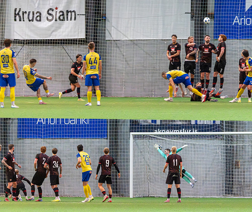 - Hallgrímur Mar Steingrímsson gerði fyrra mark KA undir lok fyrri hálfleiks. Liðið fékk aukaspyrnu nokkrum metrum utan vítateigs, gestirnir röðuðu upp þéttum varnarvegg en það skipti engu máli; Hallgrímur sendi boltann yfir veginn og efst í vinstra horn marksins. Aron Snær Friðriksson var ekki nálægt því að verja. Myndir Ármanns Hinriks af marki Hallgríms eru hér að neðan.