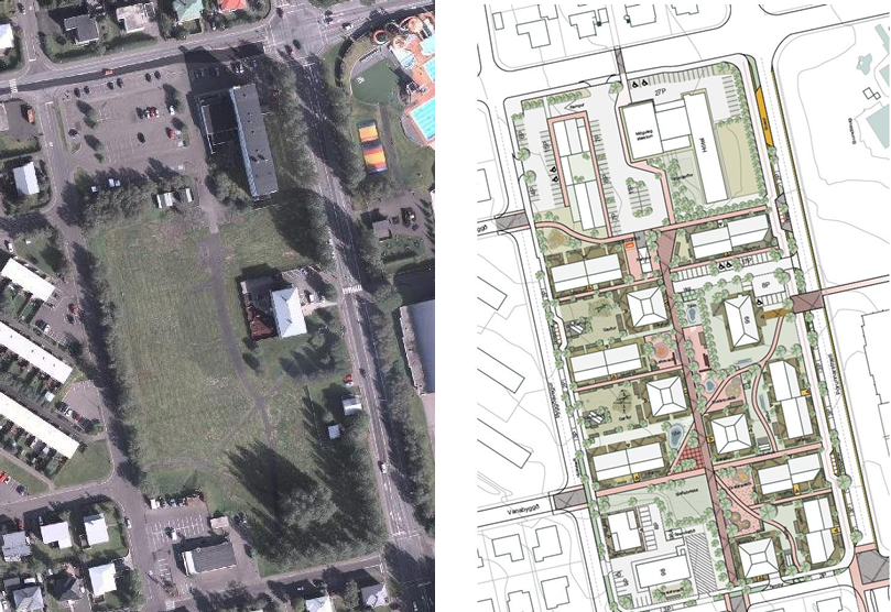 Tjaldsvæðisreiturinn, lofftmynd og væntanleg byggð. Skjáskot úr kynningu skipulagssviðs Akureyrarbæjar.