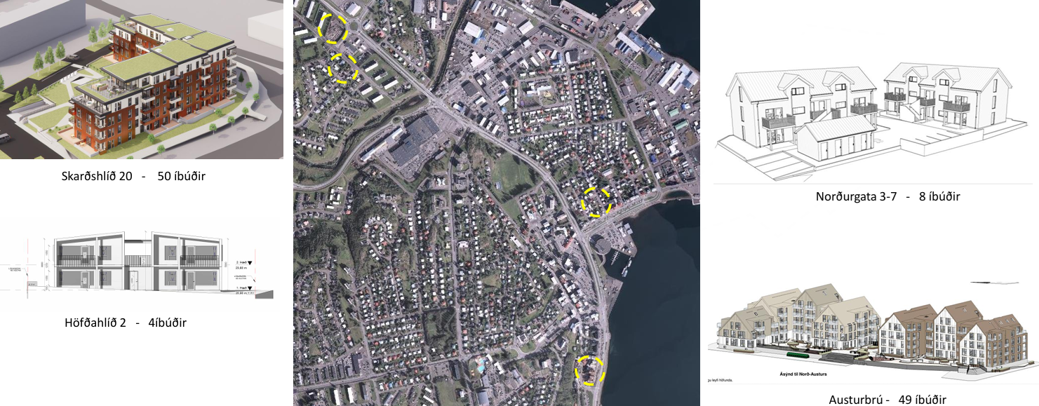 Framkvæmdir eru í gangi á fjórum svokölluðum þéttingarreitum, Skarðshlíð 20, Höfðahlíð 2, Norðurgata 3-7 og Austurbrú. Þrjár myndanna eru úr kynningu skipulagssviðs Akureyrarbæjar.