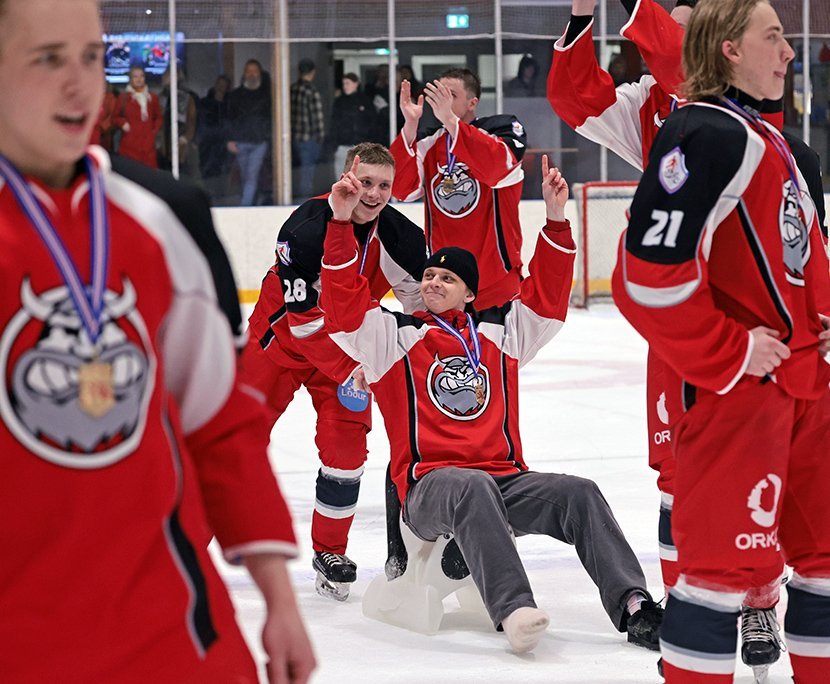 Atli Sveinsson fagnar Íslandsmeistaratitlinum síðastliðið vor ásamt Unnari Hafberg Rúnarssyni og fleiri liðsfélögum. Atli ökklabrotnaði í næstsíðasta leik úrslitarimmunnar í vor, en er mættur á svellið og skoraði fyrstu þrjú mörk SA Víkinga í mótinu í Litháen. Mynd: Rakel Hinriksdóttir.