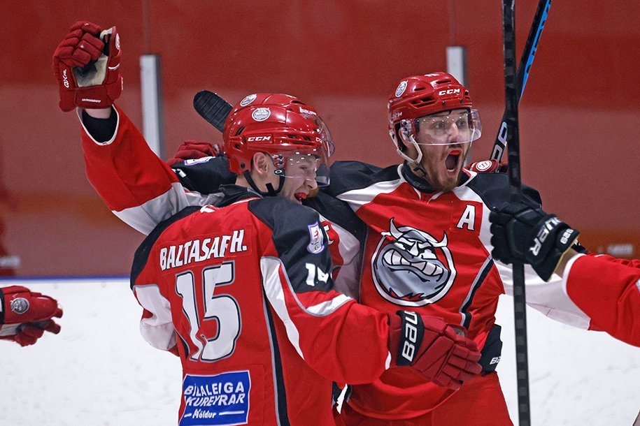 Baltasar Hjálmarsson og Jóhann Már Leifsson fagna marki í úrslitarimmunni við SR í vor. Jóhann Már var valinn besti leikmaður SA Víkinga í öðrum leik liðsins í Litháen. Mynd: Rakel Hinriksdóttir.