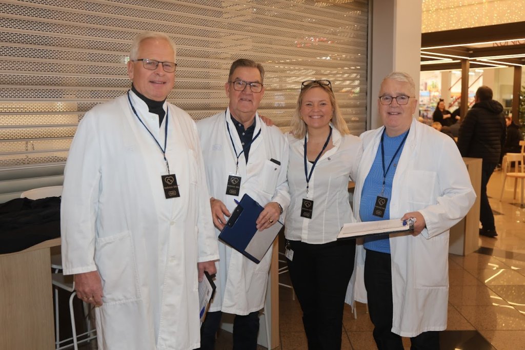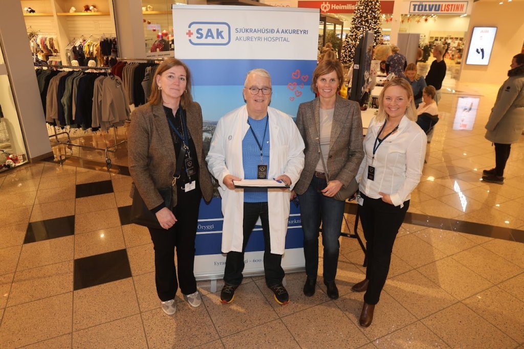 Hilda Jana Gísladóttir, samskiptastjóri Sjúkrahússins á Akureyri, ásamt þremur stjórnarmönnum Hollvinasamtaka SAk á Glerártorgi í dag. Frá vinstri: Bjarni Jónasson, Hermann Haraldsson og formaðurinn, Jóhannes Gunnar Bjarnason lengst til hægri.