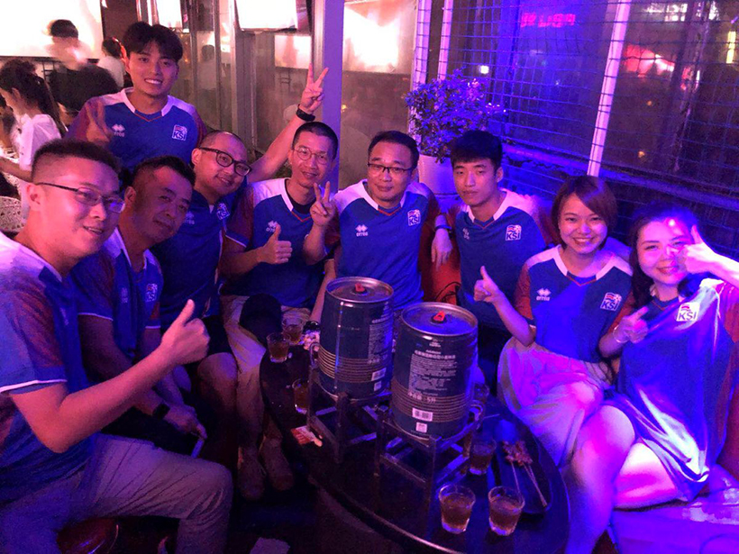 Starfsfólk Actanor Limited á góðri stund, klætt treyju íslenska landsliðsins í knattspyrnu. Actanor Limited er systurfyritæki Streymis í Hong Kong.