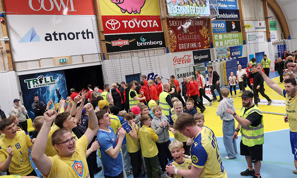 Að leikslokum mátti sjá myndir og textann BÆRINN ER GULUR á stórum skjá við norðurenda salarins. Gulklæddir KA-menn fögnuðu vel og lengi á meðan rauðklæddir Þórsarar yfirgáfu húsið, fjarri því glaðir í bragði en nú gildir hið fornkveðna: Eigi skal gráta Björn bónda, heldur safna liði! Hinn mikli rígur milli stuðningsmanna félaganna sem allir þekkja og margir hafa gaman af setti skemmtilegan svip á kvöldið í KA-heimilinu enda hið besta mál – upp að vissu marki ...