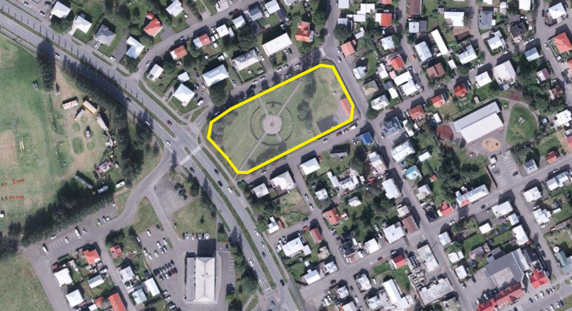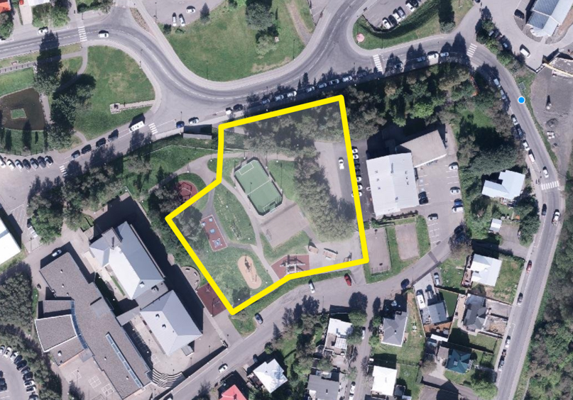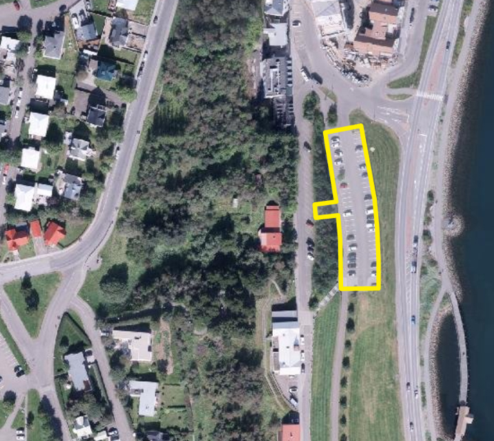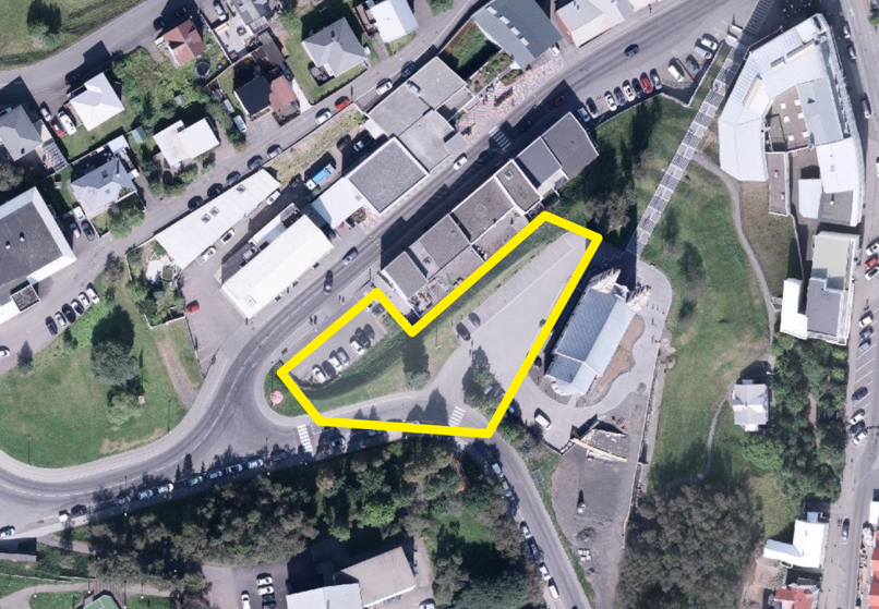 Þetta er mikið svæði sem þarna væri hægt að nýta, sjá mynd. Teiknaða svæðið á myndinni er um 5.500 m2 Á tveimur hæðum væri hægt að gera þarna mjög stórt bílastæðahús. Smá spölur er niður í bæ og líklegt að kirkjutröppurnar verði helsta leiðin sem er skemmtilegt og eykur gildi þeirra. Stuttur göngutúr sem gefur glæsileg aðkomu að miðbænum.
