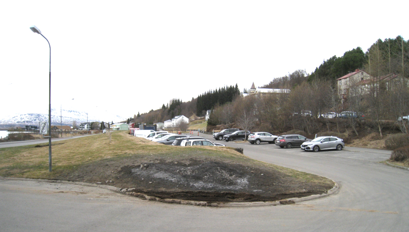 Þarna eru ýmsir möguleikar. Jafnvel væri hægt að fara aðeins undir Eyrarlandsveginn ef þurfa þykir. Þetta bílastæðahús væri meira og minna ósýnilegt en innkeyrslan væri á sama stað og nú inn á núverandi bílastæði í Gilinu neðan við planið við kirkjuna, sjá mynd. Það bílastæði yrði líklega á einhvern hátt hluti af bílastæðahúsinu. Líklega gæti þetta bílastæðahús verið tvær hæðir en nokkuð vandsamt er að útfæra það.