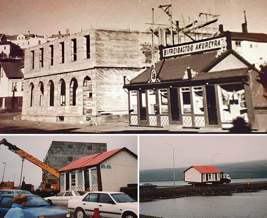 Húsið sem kemur við sögu í greininni. Á efri myndinni sem „Bifreiðastöð Akureyrar“ við hlið Landsbankahússins sem þarna er í byggingu, á þeim neðri þegar húsið hafði lokið því hlutverki að vera verslun „Odds í Höfn“ og var flutt austur að Ljósavatni.