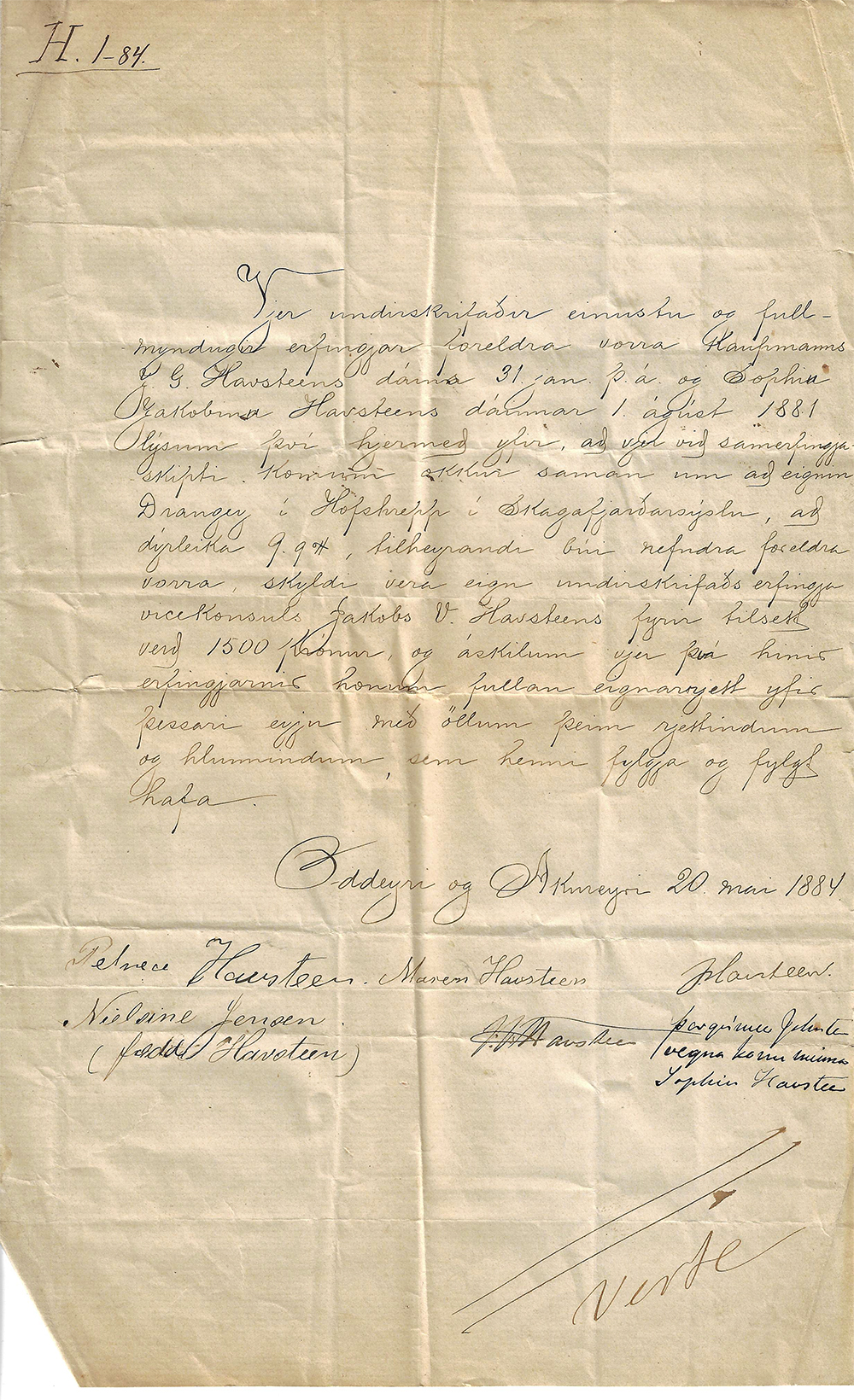 Vér undirskrifaðir einustu og fullmyndugir erfingjar foreldra vorra kaupmanns J.G. Havsteen dáinn 31. jan þ.á. og Sophiu Jakobinu Havsteen dáinnar 1. ágúst 1881 lýsum því hér með yfir, að vér við samerfingjaskipti komum okkur saman um að eignin Drangey í Hofshreppi í Skagafjarðarsýslu, að dýrleika 9.9 … [hundruð], tilheyrandi búi nefndar foreldra vorra, skyldi vera eign undirskrifaðs erfingja vicekonsuls Jakobs V. Havsteens fyrir tilsett verð 1500 Krónur, og áskilum vér því hinir erfingjarnir honum fullan eignarrétt yfir þessari eyju með öllum þeim réttindum og hlunnindum, sem henni fylgja og fylgt hafa.