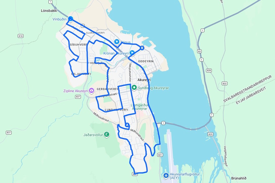 Kort af leiðinni sem viðbragðsaðilar munu aka um með kveikt á forgangsljósum. Fyrst verður ekið til norðurs og síðan gegnum Glerárhverfi suður gegnum bæinn og Drottningarbraut til baka.