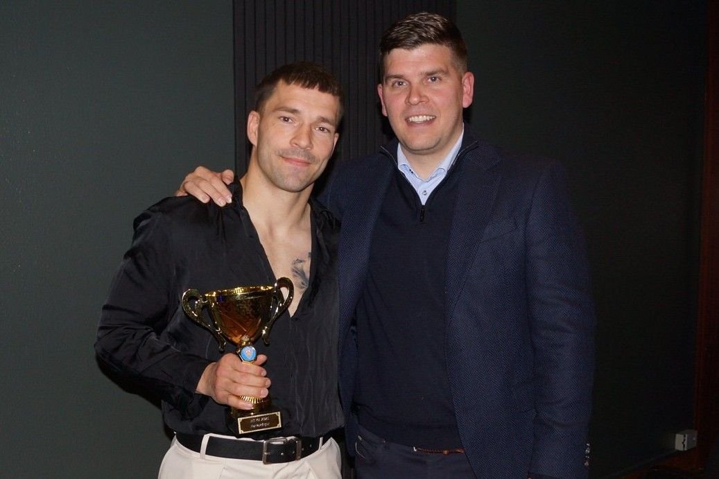 Hallgrímur Mar Steingrímsson og Hjörvar Maronsson formaður knattspyrnudeildar KA á lokahófinu í gærkvöldi. Mynd af vef KA.
