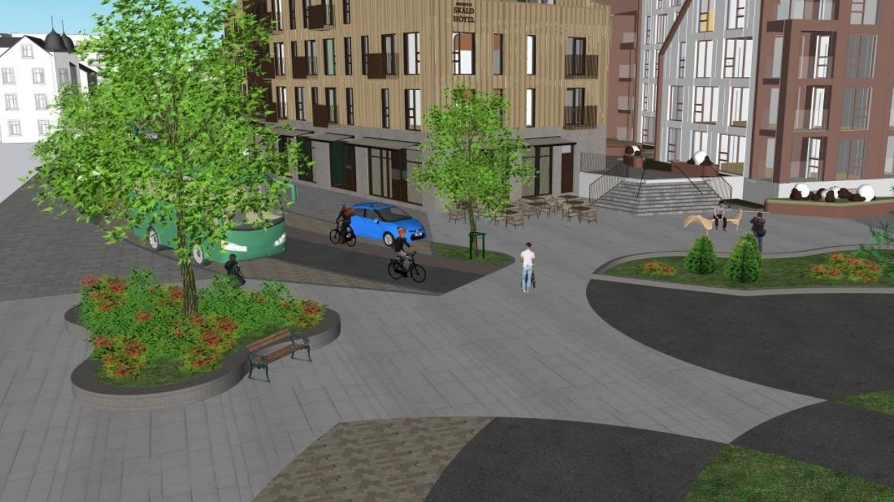 Svona gæti torgið syðst í vistgötunni, framan við Skáld hótel litið út. Tillöguteikning úr hönnunardrögum Akureyrarbæjar.