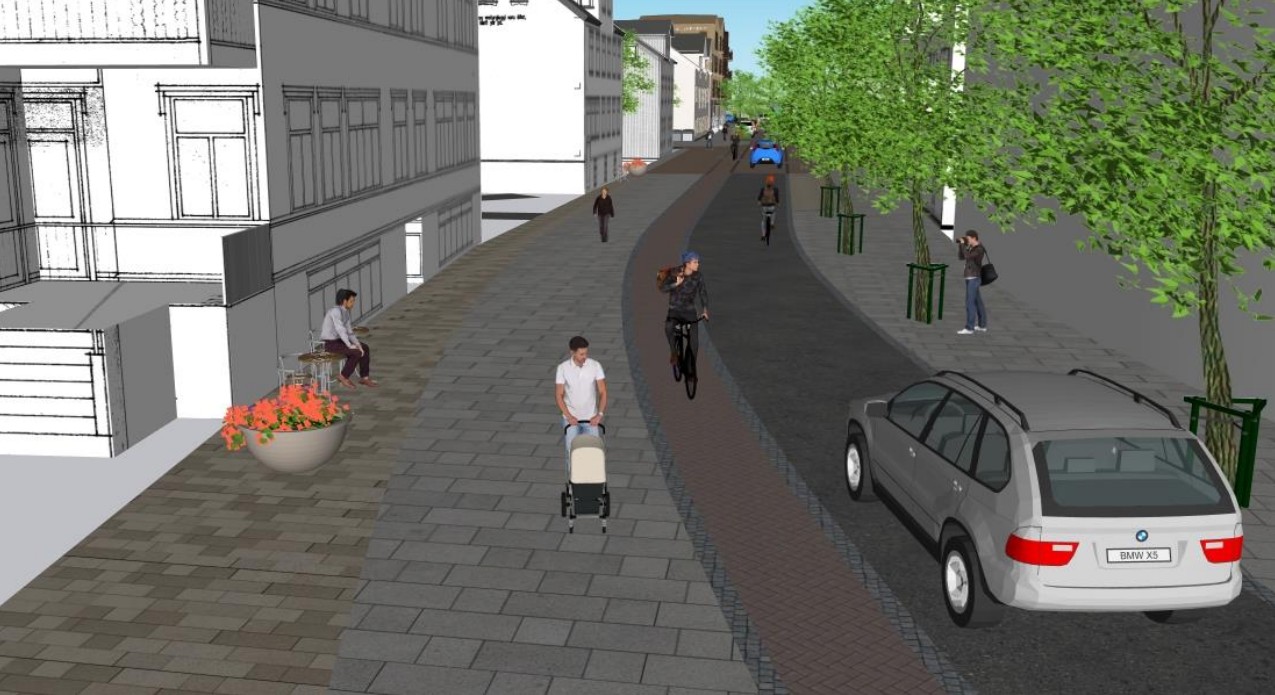 Horft suður Hafnarstræti. Tillöguteikning úr hönnunardrögum Akureyrarbæjar.