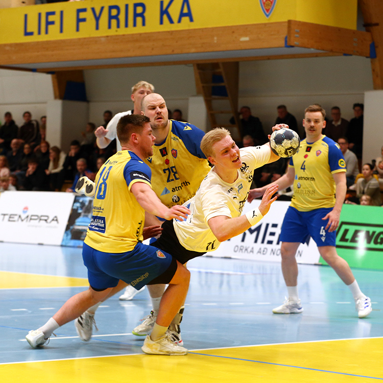 KA-strákarnir byrjuðu af krafti í kvöld og voru komnir þremur mörkum yfir rúmar níu mínútur, 6:3. Gestirnir héldu ró sinni þrátt fyrir það, minnkuðu muninn hægt og bítandi og komust yfir þegar rúmar 25 mín. voru liðnar – 11:10 – í fyrsta skipti síðan þeir gerðu fyrsta mark leiksins.