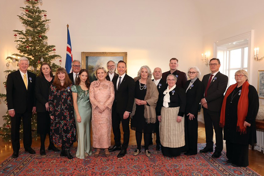 Á myndinni eru forsetahjónin, Halla Tómasdóttir og Björn Skúlason, ásamt fálkaorðuhöfum – öðrum en Kristjáni Kristjánssyni – á Bessastöðum í dag. Eftirtaldir hlutu orðuna í dag: