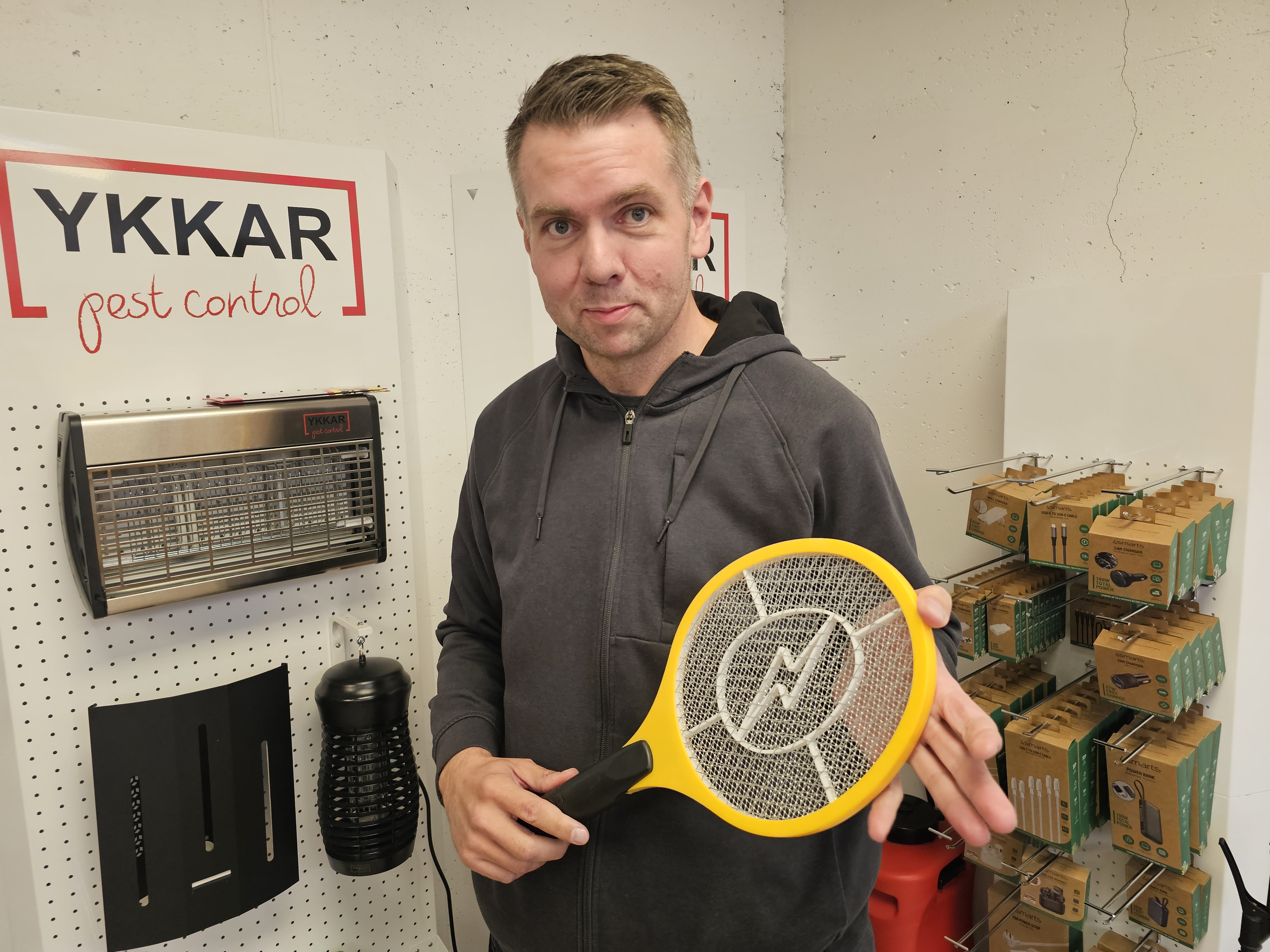 Halldór Andri, sem er framkvæmdastjóri Streymis á Akureyri, mundar flugnaspaðann. Heildsalan selur allt sem tengist meindýravörnum en meiri fjölbreytileiki í skordýrum á Íslandi kallar á fjölbreyttari varnir.
