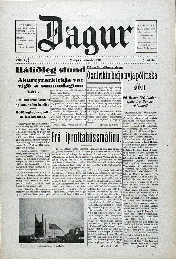 Dagur kom út á fimmtudegi, 21. nóvember. Þar kemur fram að séra Sigurður Stefánsson á Möðruvöllum las bæn í kórdyrum „og var því hinn fyrsti prestvígðra manna sem ávarpaði söfnuðinn í hinni nýju kirkju. Biskupinn, herra Sigurgeir Sigurðsson, flutti vígsluræðu en vígslubiskup séra Friðrik J. Rafnar, predikun.“