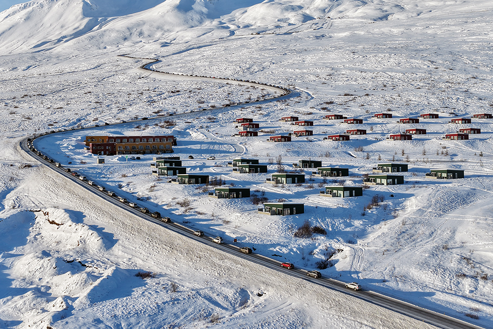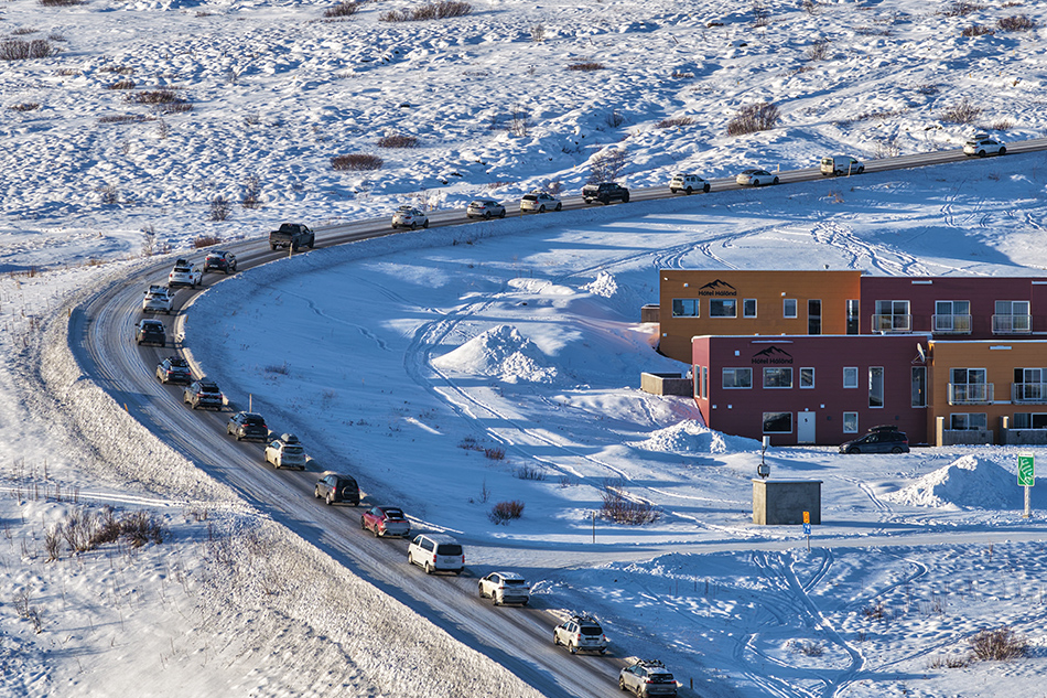 Ekki er nóg með að margir séu á skíðasvæðinu heldur er fjöldi fólks einnig á leiðinni þangað. Langt er síðan röð bíla á leið í fjallið hefur verið jafn löng; eins og sjá má á myndum Þorgeirs Baldurssonar, sem teknar voru um kl. 11 náði röðin niður fyrir frístundabyggðina Hálönd sem er miðju vegu milli efstu byggðar og skíðasvæðisins.