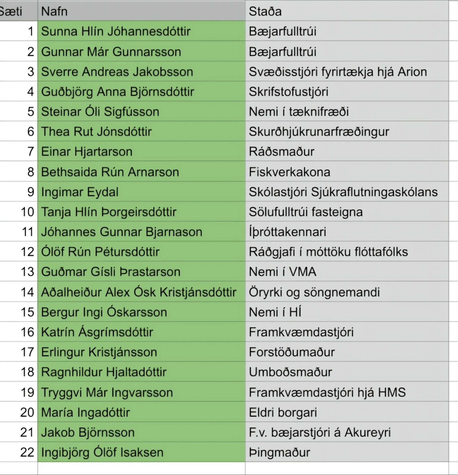 Sverre Andreas Jakobsson svæðisstjóri fyrirtækja hjá Arion verður í 3. sæti en var einu sæti neðar í kosningunum 2022. Guðbjörg Anna Björnsdóttir, skrifstofustjóri, verður í fjórða sæti. Listinn var birtur í dag, hér má sjá hann í heild: