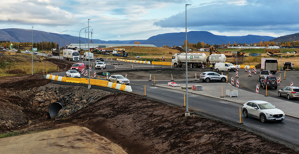 Búið er að malbika helminginn af hringtorginu, en ekki þann hluta sem ekinn er á leið til Akureyrar – með aksturstefnu til suðurs. „Því eru hæðarbreytingar í miðju hringtorginu sem þarf að varast,“ segir í tilkynningunni.