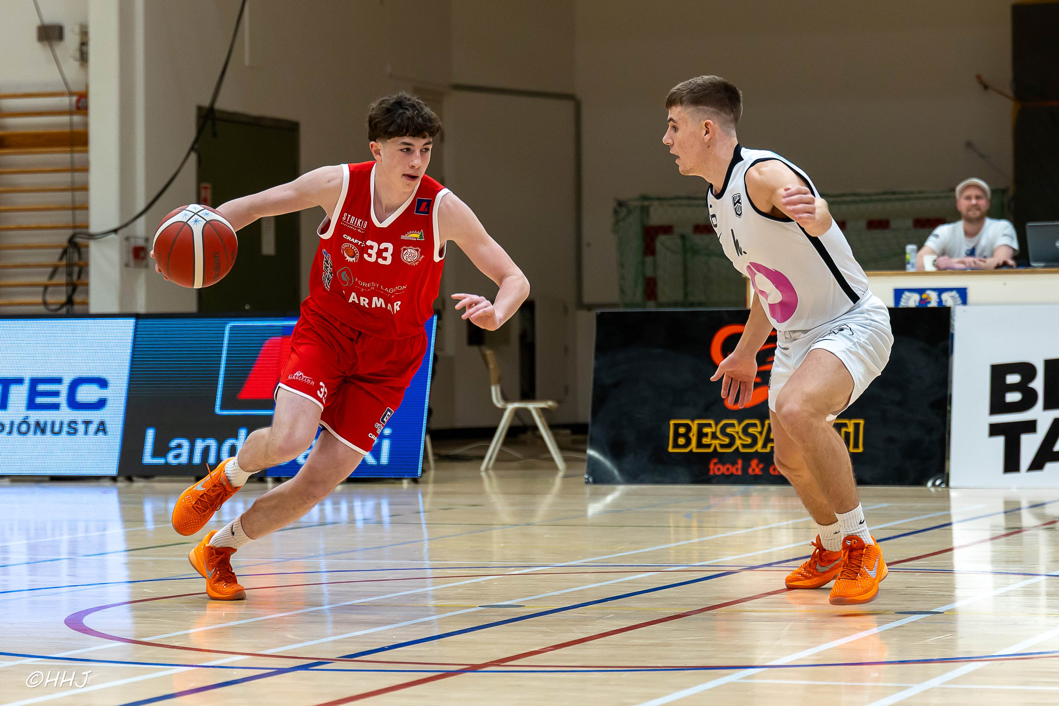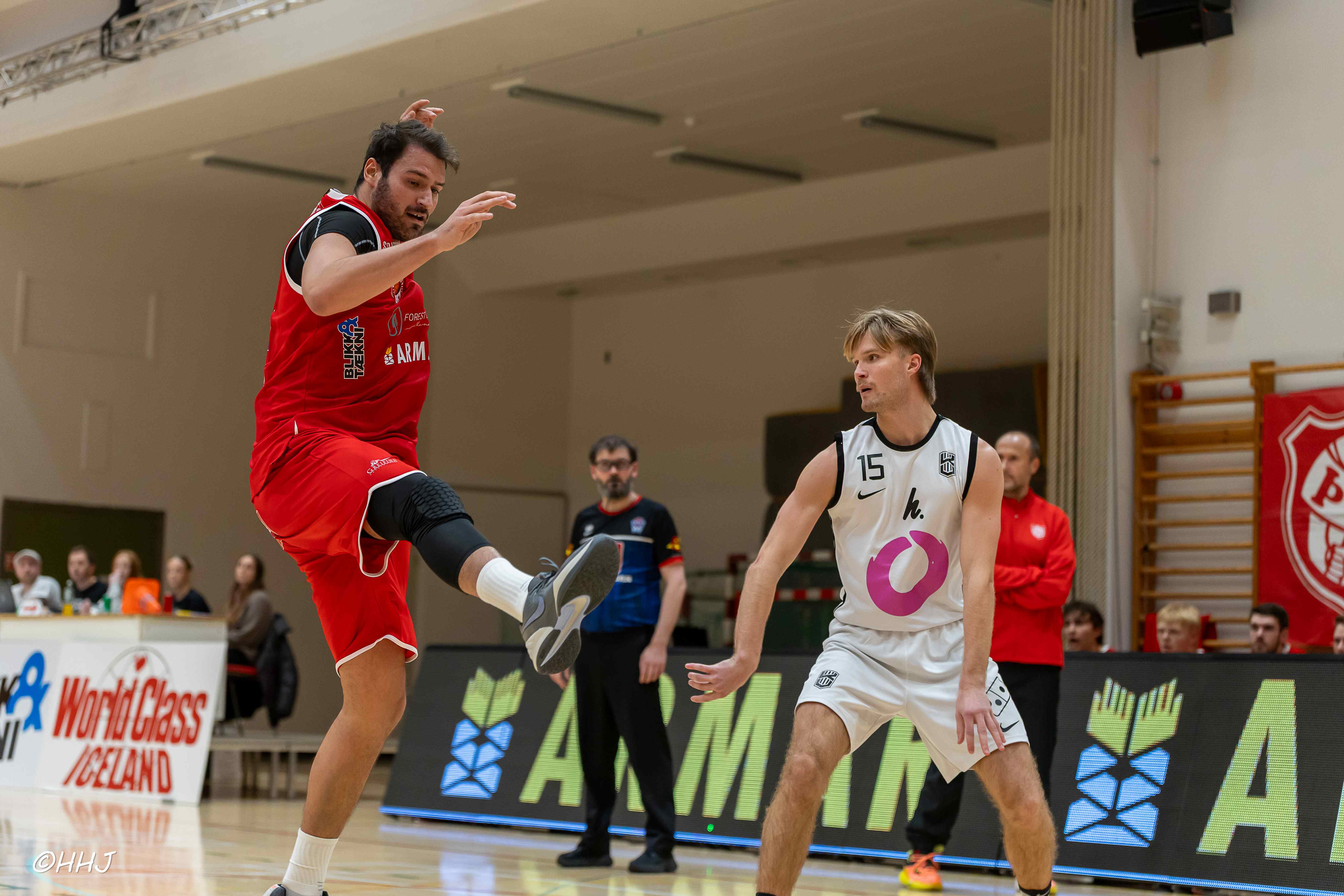 Pétur Cariglia var öflugur í upphafi leiks og hitti vel, skoraði átta stig á fyrstu fimm mínútum leiksins. Hér sækir hann að Reyni Barðdal Róbertssyni, fyrrum leikmanni Þórs. Mynd: Helgi Heiðar Jóhannesson.