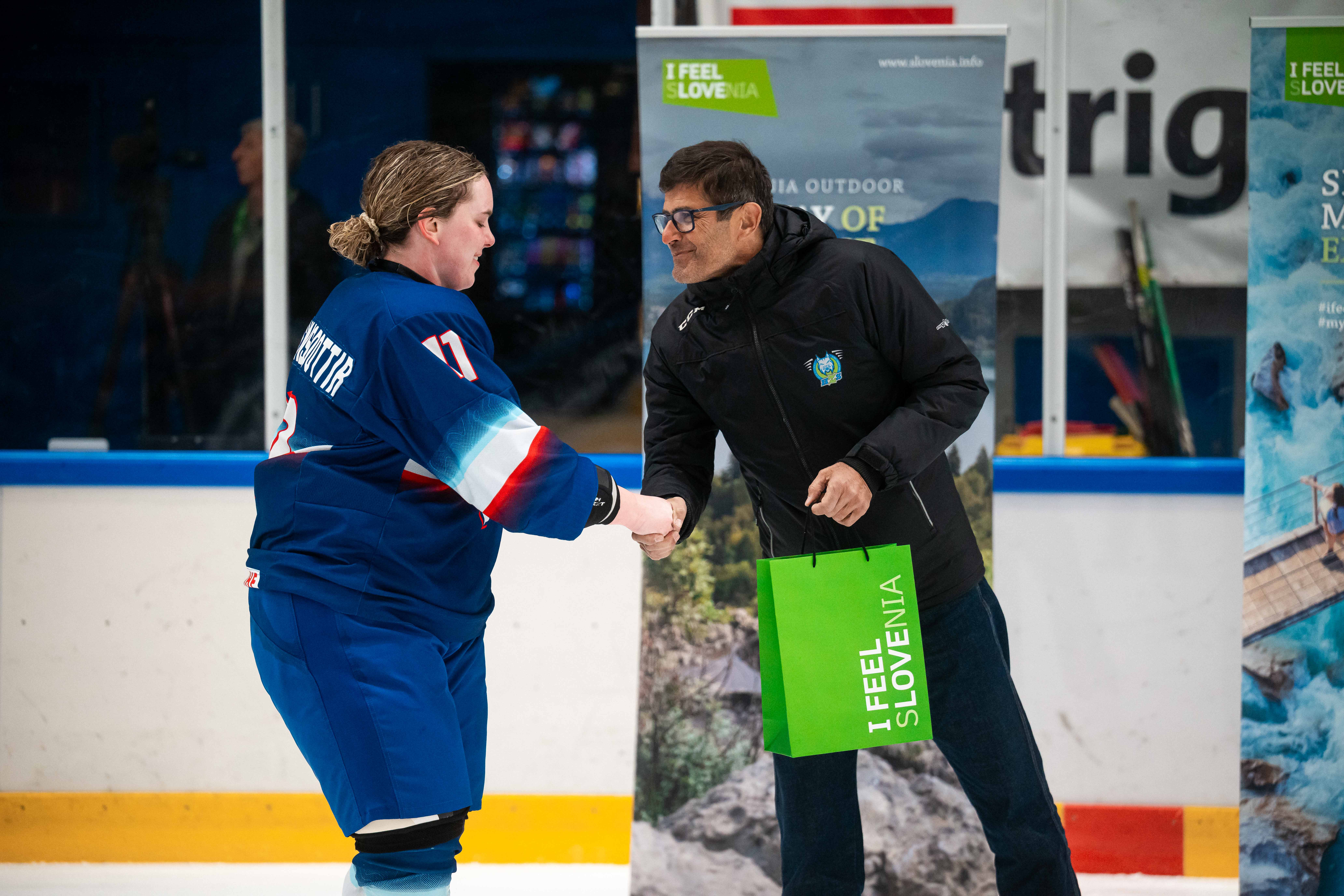 Silvía Rán Björgvinsdóttir, leikmaður SA, var valin maður leiksins í eina sigri íslenska liðsins þar sem hún skoraði tvö mörk í þriðja leikhluta í viðsnúningi þegar Ísland vann gestgjafana í Slóveníu, 4-3, í fyrsta leik. Smellið á myndina til að opna myndaalbúm frá leiknum. Mynd: IIHI/IHI.