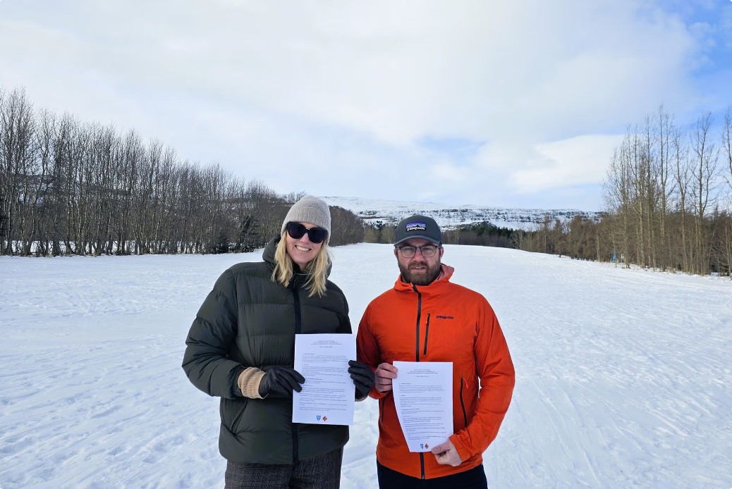 Ásthildur Sturludóttir bæjarstjóri og Birkir Baldvinsson, formaður Súlur Vertical, undirrituðu samninginn í Kjarnaskógi. Mynd: akureyri.is.