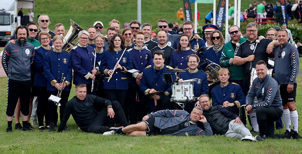 Lið á Pollamótinu bregða gjarnan á leik. Eitt þeirra er akureyrski hópurinn Ginola en hann hefur einnig gert góðverk, safnaði til dæmis rúmlega einni milljón króna fyrir MND samtökin eitt árið. Þessi mynd var tekin 2023 þegar Ginola fékk Lúðrasveit Akureyrar til að mæta á svæðið og einn Ginola-félaginn lét orðin ofar myndarinnar falla. Hljómsveitin lék nokkur fjörug lög á meðan liðsmenn hituðu upp fyrir leik eftir hádegið, sagði í umfjöllun akureyri.net, og bætt var við: „Engum sögum fer af úrslitum en gárungarnir töldu næsta víst, áður en athöfnin hófst, að hljómsveitin myndi leika betur en liðið!“
