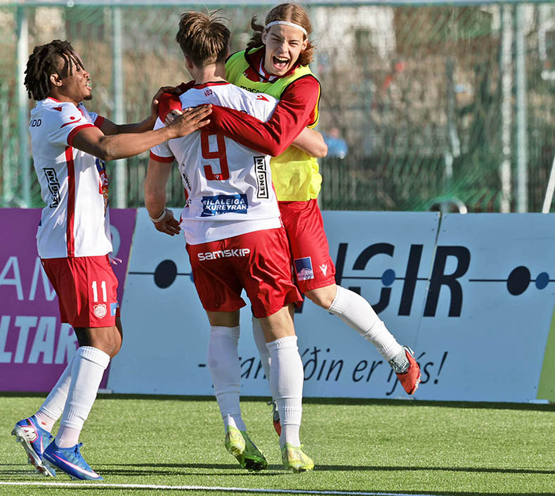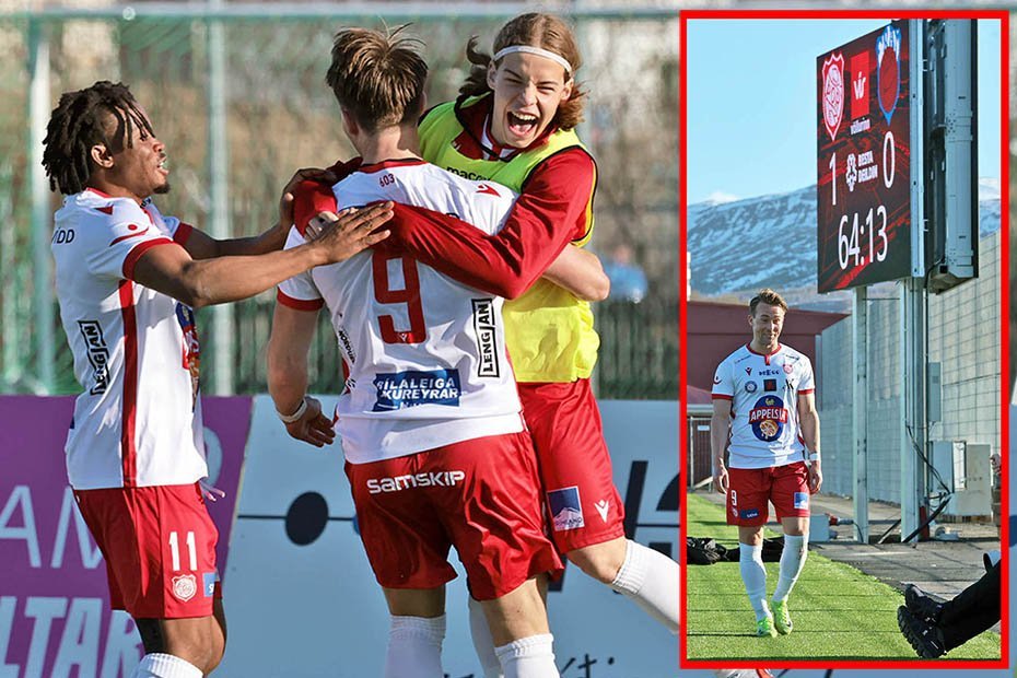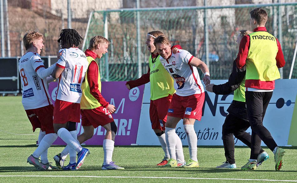 Varamenn Þórs, sem hituðu upp við suðvesturhorn vallarins, fögnuðu að vonum innilega þegar markaskorarinn hljóp til þeirra andartaki eftir að boltinn söng í netinu. Kristófer Kató Friðriksson, Ágúst Eðvald Hlynsson, Aron Ingi Magnússon og Ingimar Arnar Kristjánsson tóku vel á móti honum, og Einari Frey Halldórssyni og Isaac Atanga sem eltu Norðmanninn.